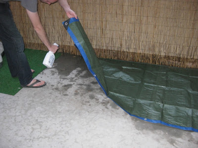 So yesterday, I came up with another idea. My original idea was getting a child's 3 foot wading pool and filling it with mulch (my dog prefers mulch over grass), but in August, I could not find a darn pool. They stop selling them in June or July (which makes no sense). I made another trip to Lowe's and picked up a few supplies. I got a large tarp, 2 large bags of Mulch (they had different colors and even rubber), and Concrobium (kills and prevents mold). I originally purchased something to contain the mulch in, some plastic siding, but figured my dog wouldn't want to step over it to get to the mulch. If it rains regularly where you live, it's important to put siding up to keep your mulch in and create a drainage system. I'm in Southern California, we barely get any so I'm not too worried. Here's what I did.